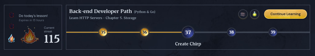 I lost some momentum on my bootcamp journey in recent days. Both “embers” in the flame panel have gone dim (see banner), signifying I haven’t submitted any work for two days. I had made it a point of pride that those embers were never lost. So, what’s really going on? I’m working on Chapter 5: Storage. CH 5 - Lesson 2 (Goose Migrations) - Postgres SQL schema migrations CH 5 - Lesson 3 (SQLC) - Code generator from SQL commands CH 5 - Lesson 4 (Database Review) - Quick notes about dialects and a pop quiz CH 5 - Lesson 5 (Create User) - We have the SQL defined, now wire up the API handler CH 5 - Lesson 6 (Create Chirp) - CRUD operations for “chirps” (where I am now) We’d been down the Goose and SQLC road in a previous course, so I thought I’d blast right through this part....
